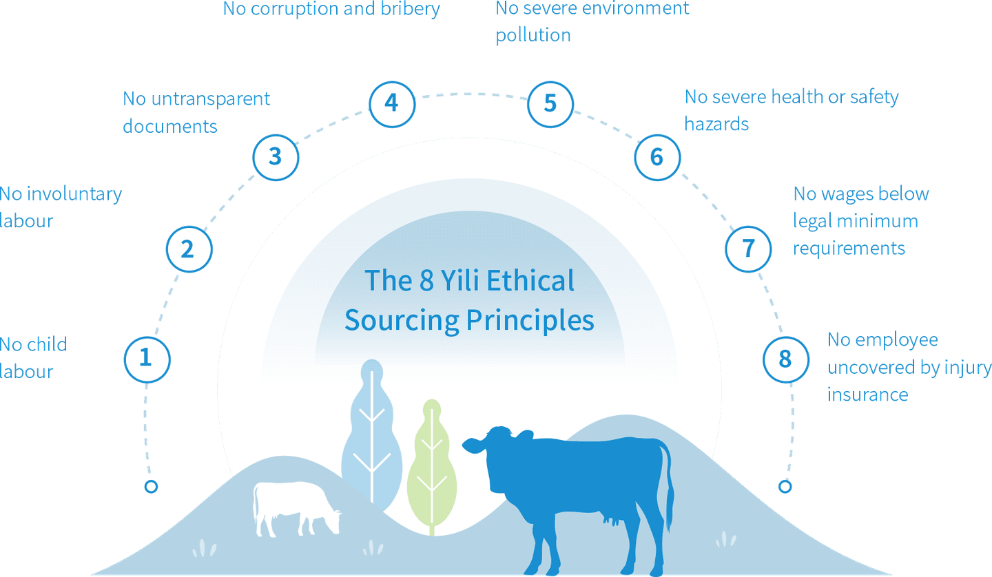 The dairy industry spans a range of sectors including cultivation, breeding, and manufacturing, and has a long and complex supply chain system. We progressively devise and refine our ethical sourcing policies and standards by engaging in the exploration, study, and adoption of principles and practices related to responsible procurement from industry leaders and aligning with relevant laws and regulations of our operational countries. As a foundation for doing business with Yili, our suppliers are required to sign a "Responsible Supply Chain Commitment", recognizing Yili's standards for ethical sourcing and meeting the following eight basic principles.