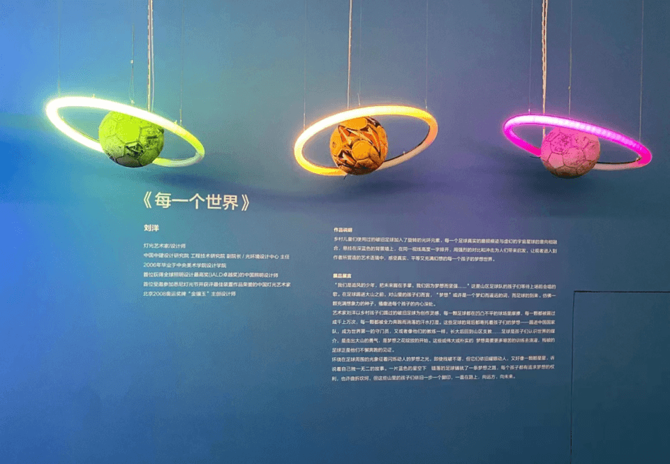 燈光藝術(shù)家、北京2008奧運(yùn)獎牌“金鑲玉”主創(chuàng)設(shè)計師劉洋,用“平等”來詮釋他對公益的理解。他創(chuàng)作的《每一個世界》,在鄉(xiāng)村孩子們踢過的破舊足球外加入旋轉(zhuǎn)的光環(huán)元素,并一字排開懸掛在深藍(lán)色的背景之下,寓意著每一個孩子的“夢想星球”真實而又平等。